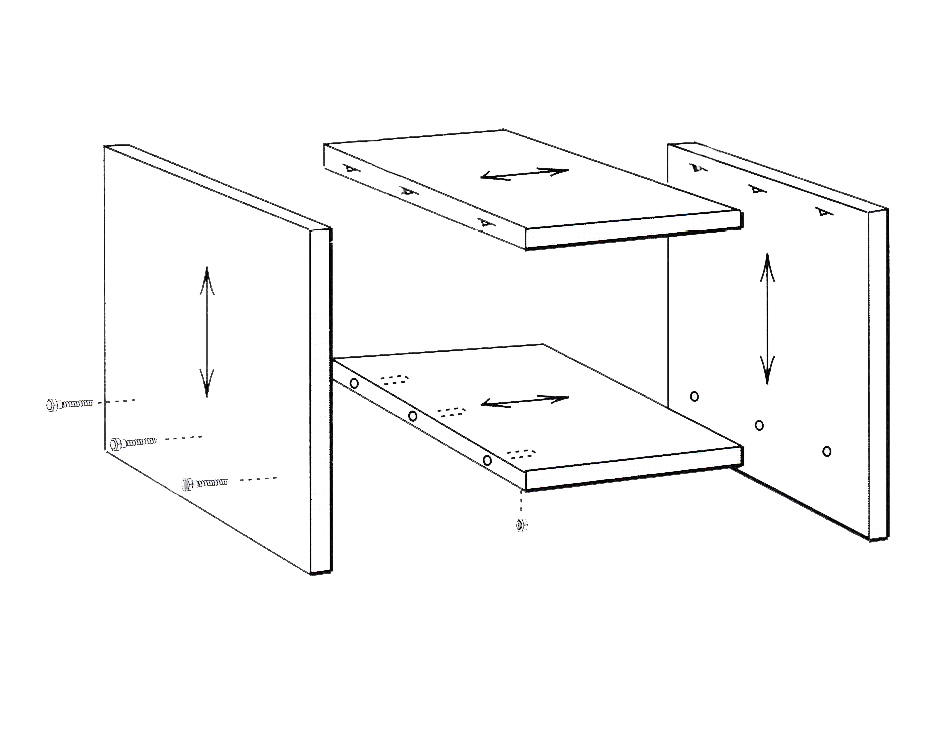 Un boulon traverse la paroi latérale et s’engage dans un écrou inséré sous la tablette.