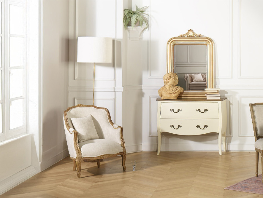 Fauteuil Louvre cabriolet lin patine bois naturel