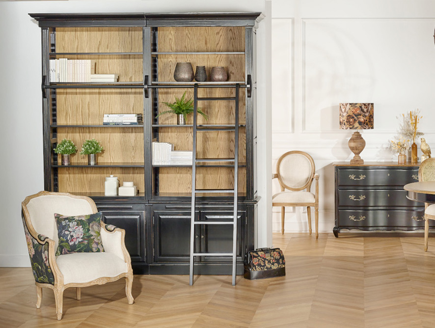 Ce style romantique privilégie les montants aux formes douces, les patines claires qui apportent de la lumière et les corniches légères qui évoquent le mobilier ancien. La bibliothèque François ivoire ou la bibliothèque vitrine Aragon gris clair incarnent cette douceur intemporelle qui réchauffe le salon.