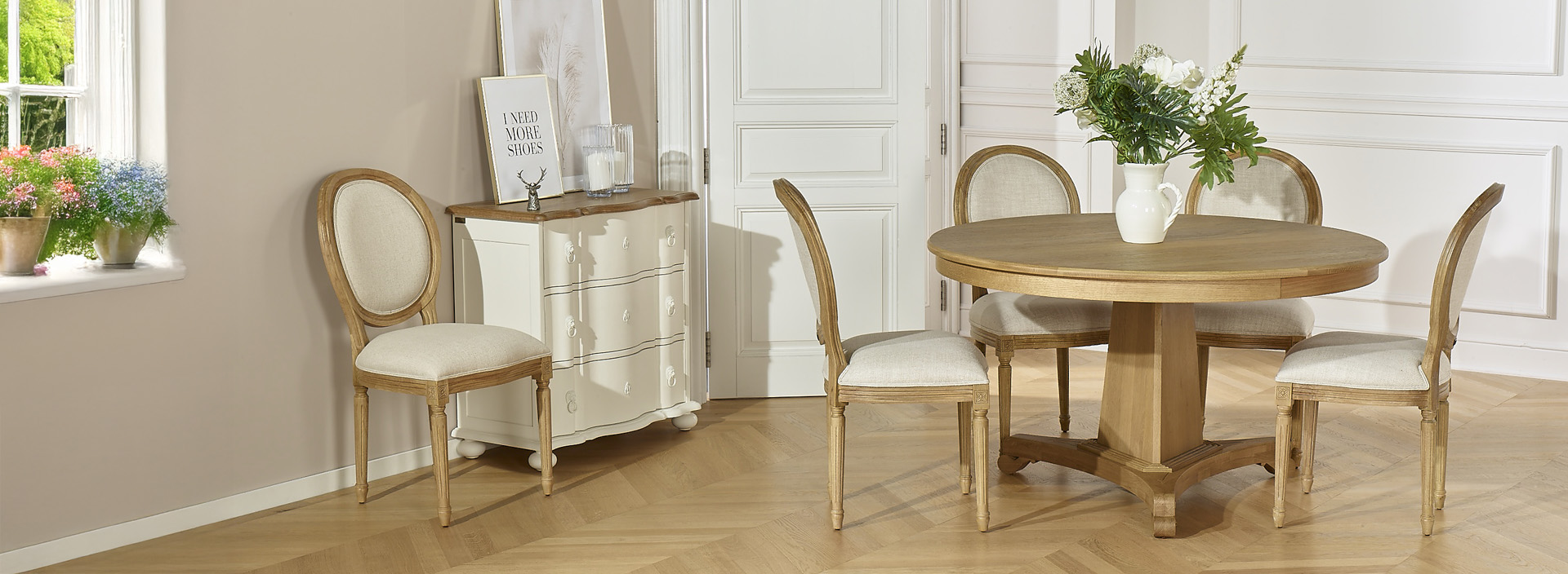 Unsere Kollektion von Shabby-Chic-Möbeln mit klassischer Inspiration interpretiert unser reiches Erbe an französischen Stil-Möbeln neu. Antik patinierte Oberflächen in warmen Farbtönen, Eichenplatten, üppige Kurven und raffinierte Schnitzereien - die Shabby-Chic-Kollektion zelebriert eine gewisse "Art de vivre à la française". Entdecken Sie unsere Cabrioletsessel Victor im Louis-XV-Stil, unseren AUDE-Tisch mit gedrechselten Beinen, unsere Medaillonstühle und unsere Holzkommoden mit geschwungenen Formen. Lassen Sie sich von dieser barocken und romantischen Welt überraschen, die uns manchmal dazu bringt, sehr zeitgenössische Stoffe oder moderne Materialien zu wählen.