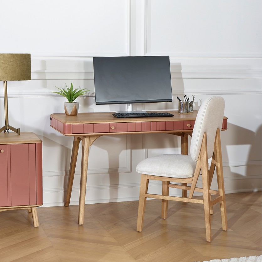Seine abgerundeten Kurven und schlanken Beine verleihen ihm eine elegante Silhouette, während seine runden Holzgriffe seinen schicken Charakter unterstreichen. Durch das Spiel mit der Kombination aus farbigem Kontur und Eichenplatte gewinnt Ihr Schreibtisch an Charakter und Einzigartigkeit.