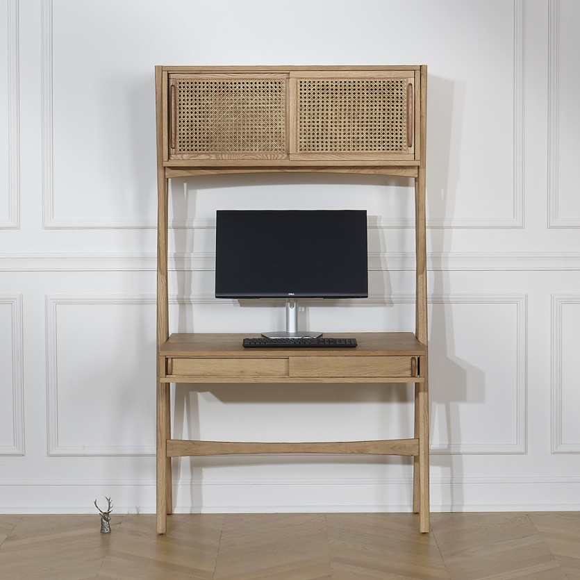 Die Türen aus Flechtwerk, verstärkt durch Zapfverbindungen aus massivem Eichenholz, verleihen diesem Schreibtisch eine einzigartige Authentizität. Die Aufbewahrungseinheit besteht aus einer Schublade, die durch zwei Schiebetüren geschlossen wird, und einem speziellen Bereich, der mit einer Öffnung für eine diskrete und effiziente Kabelverwaltung ausgestattet ist.