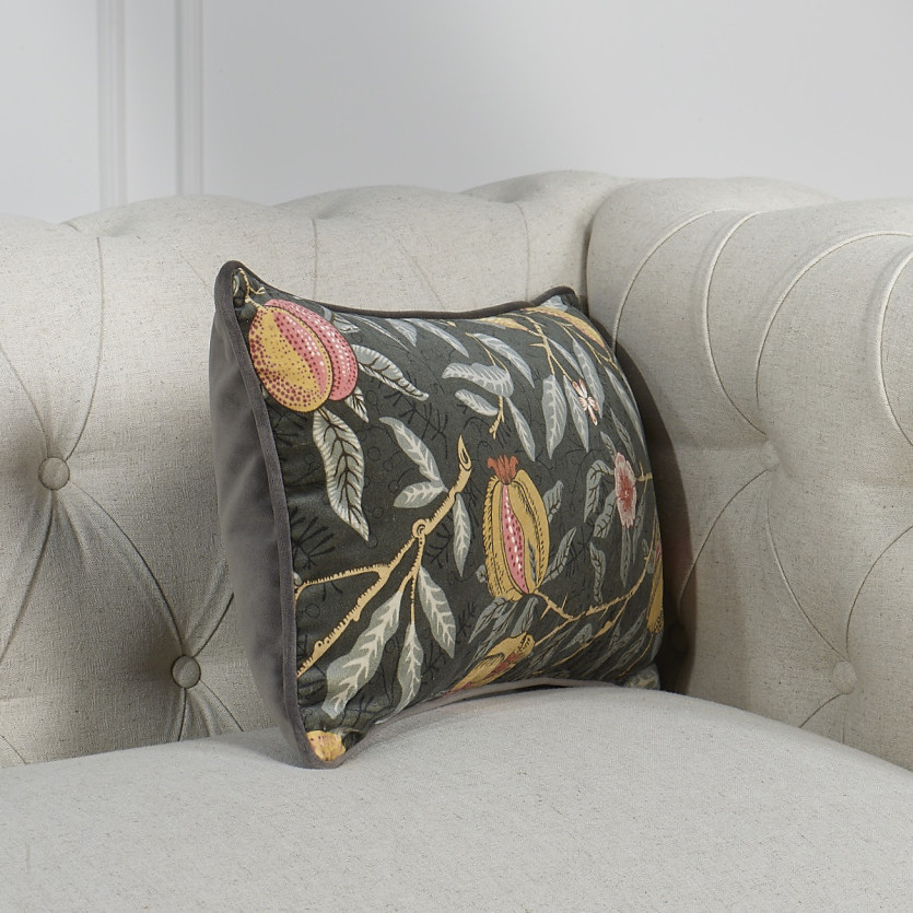 Mit seinem reich detaillierten Muster auf der Vorderseite und der weichen Samtrückseite vereint es Komfort und Stil. Sein abnehmbarer Bezug macht es zu einer praktischen und langlebigen Wahl. Die graue Samtpaspelierung ist nicht nur eine ästhetische Ergänzung, sondern verstärkt auch die Struktur des Kissens und gewährleistet seine Langlebigkeit.