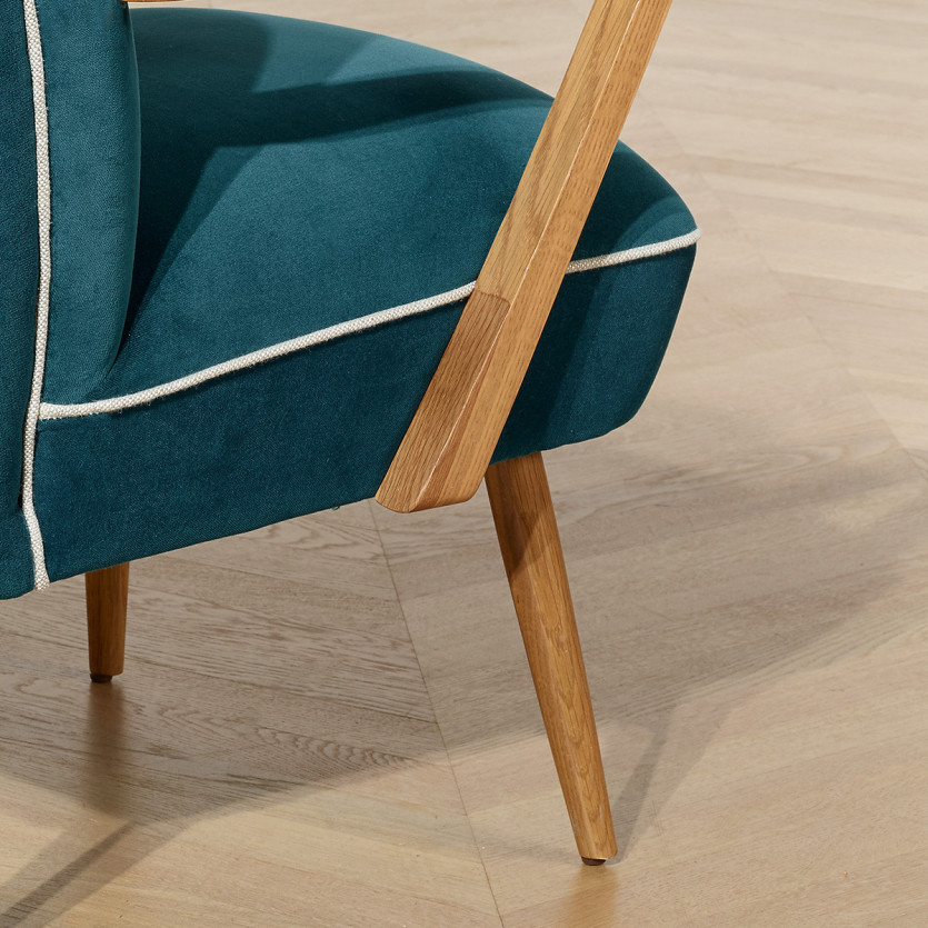 The SIXTY armchair with vintage Scandinavian design is the perfect companion for relaxing moments. Its dimensions make it both comfortable and compact, ideal for enhancing your living room without cluttering it. Evoking the 60s with its lounge chair shape, this armchair offers a welcoming seat with its generous padding in 35 kg/m3 high-resilience foam and support on elastic straps. Dressed in cotton velvet and available in a range of vibrant colors, it adds a touch of dynamism to any interior decor. The careful finishes, with stitched and piped seams, demonstrate attention to detail. With its solid pine structure and legs and armrests in solid rubberwood, the SIXTY armchair combines retro elegance and robustness to fit seamlessly into current trends.