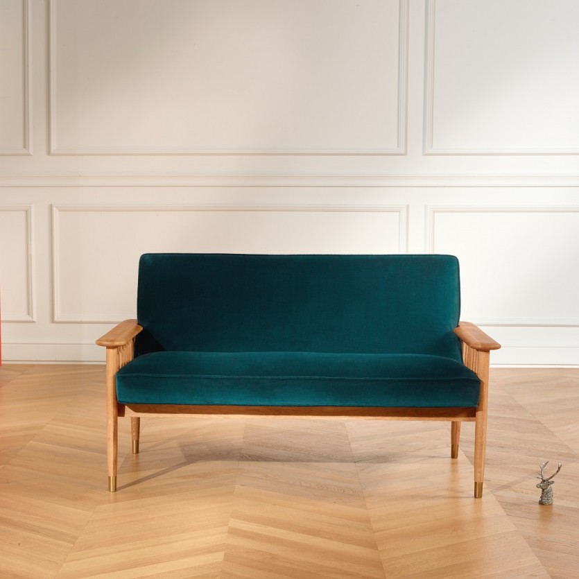 Its solid oak structure ensures reliable sturdiness, while the slatted armrests are wide enough for practical everyday use. The solid oak legs adorned with brass details accentuate the elegance of this bench. The clean lines and contemporary design of the ALBERTINE bench make it a relevant choice for lovers of characterful furniture.
