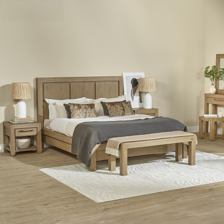 Designed to accompany your life moments, it welcomes you during long evenings of reading as you lean against its graphic headboard, or during lazy mornings, enveloped in your favorite sheets. Its natural shade brings softness and instantly highlights your bedding, whether plain, colorful, or textured.