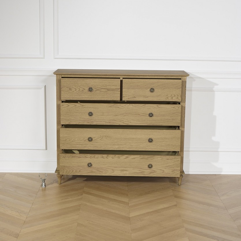 Nuestra cómoda OLIVIA seduce por su estructura y patas de roble macizo, finamente talladas para un encanto único. Su tablero de roble macizo está chapado sobre MDF, con encajes de roble que le confieren una considerable robustez. Sus tiradores adornados en latón antiguo, acompañados de su anillo, aportan un toque refinado e irresistible. Optimice su almacenamiento con nuestra cómoda y sus 5 cajones inteligentemente organizados, ofreciendo 3 cajones espaciosos en la parte inferior y 2 cajones elegantemente compartimentados en la parte superior.