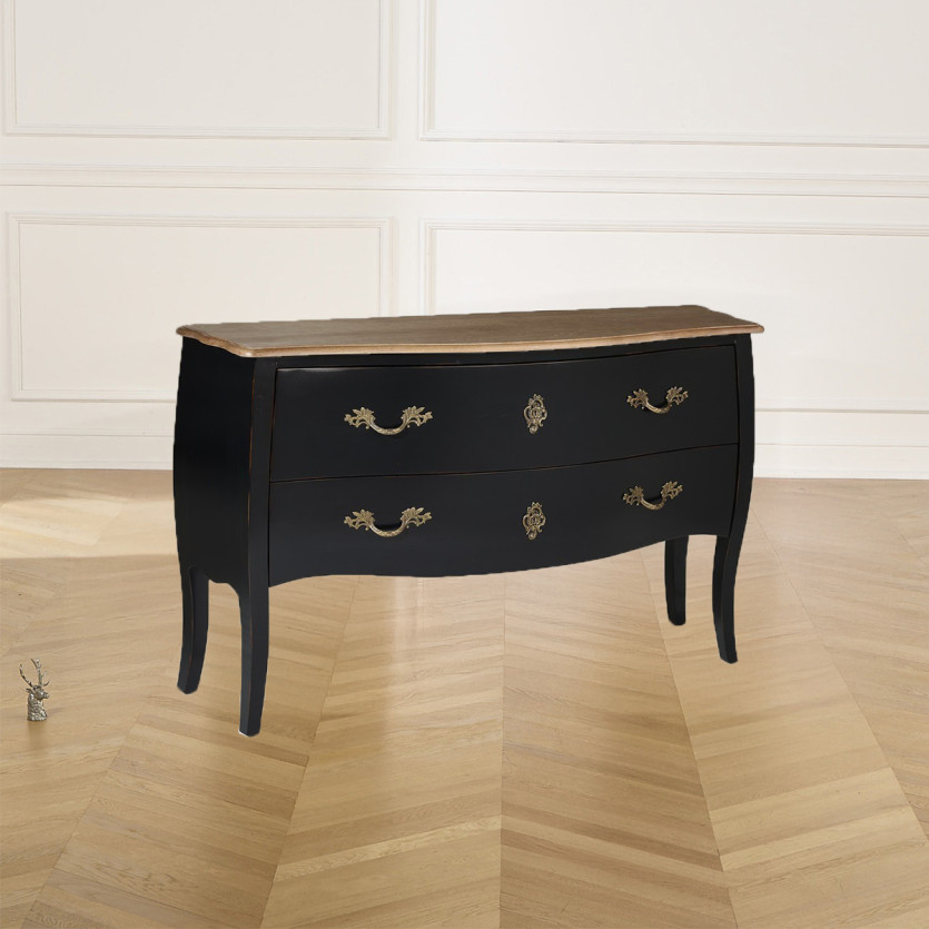Sus tiradores y herrajes de estilo Luis XV confieren el acabado perfecto al conjunto al aportar un hermoso contraste entre el negro lacado y el bronce.