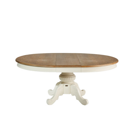 Muy elegante y refinada con su tablero de roble y su pie central. Esta mesa permite recibir hasta 10 invitados gracias a su extensión central. Sus invitados apreciarán su convivencia y nunca se verán molestados por una pata de mesa. Su fabricación tradicional garantiza su gran estabilidad y robustez. Una mesa elegante, práctica, robusta y atemporal. Acabado pátina shabby blanco.