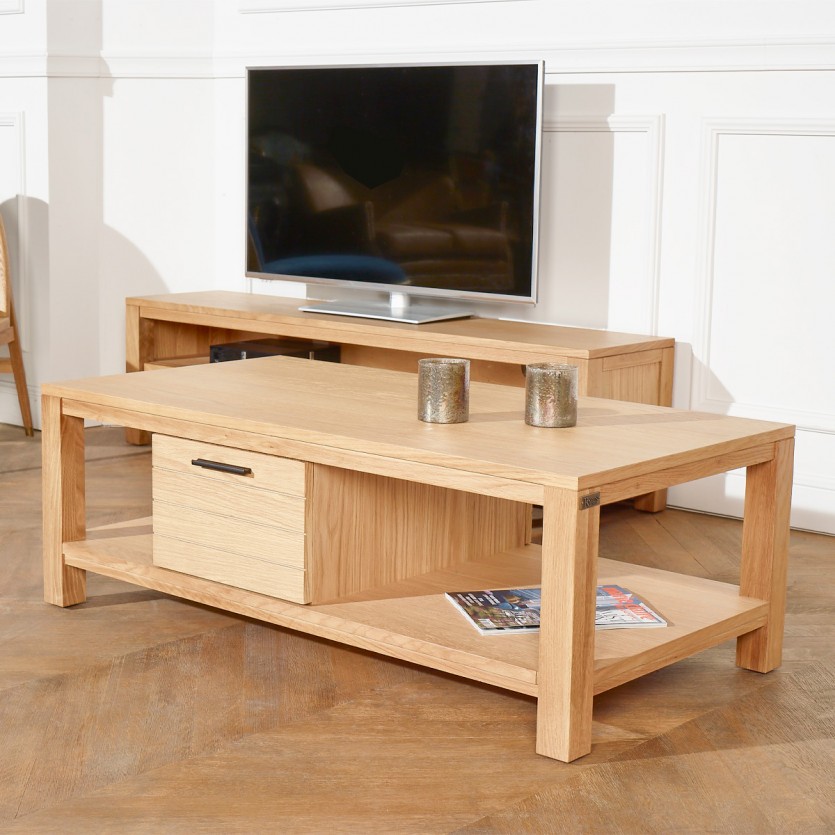 Su cajón, equipado con un tirador de metal, permite tener a mano mandos a distancia y pequeños objetos del día a día, mientras que su amplio tablero inferior acoge libros y revistas. La estructura de roble macizo, protegida por un barniz, descansa sobre tacos plásticos que preservan el suelo.
