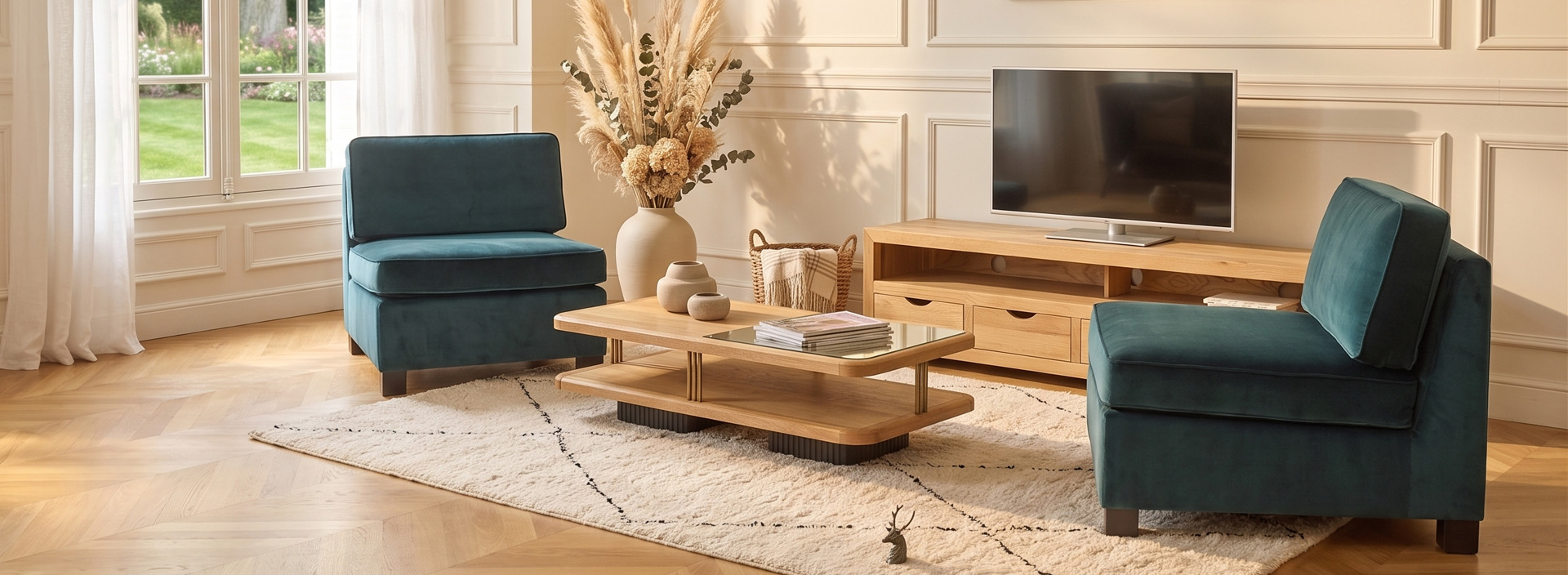 Un parfum de chêne au seuil de l'atelier. Une console aux pieds galbés qui prend sa patine. Une table bois et métal dont le plateau rugueux contraste avec le velours des sièges. Le cannage d'un fauteuil vintage qui joue avec la lumière rasante. Chez Robin des Bois, les meubles en bois massif ont une sensualité concrète — celle de la matière vraie.