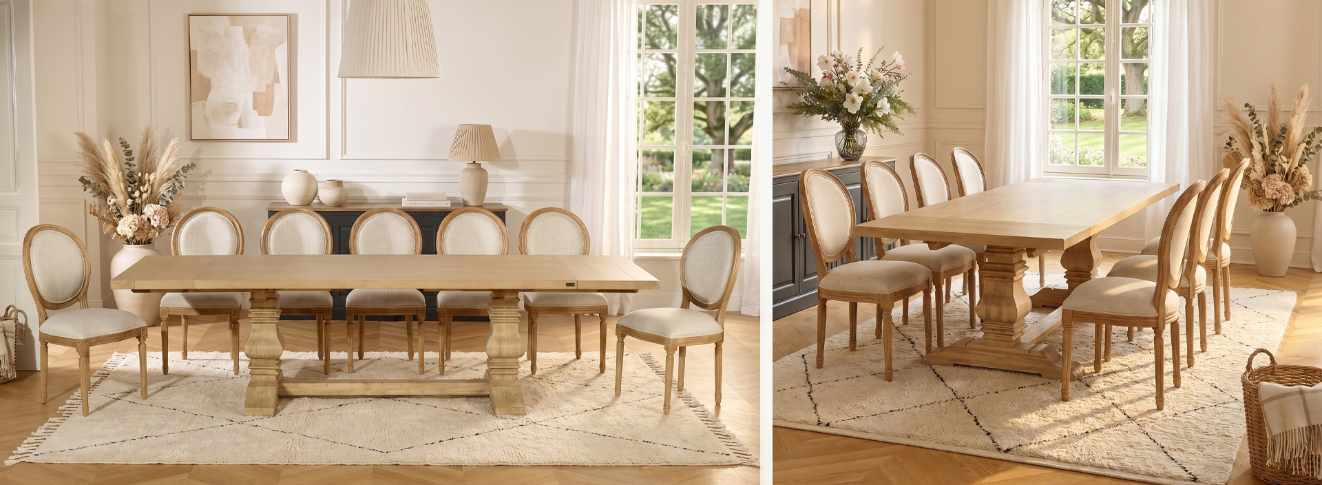 La collection meubles Shabby Chic revisite le mobilier de style français : pieds galbés, plateaux en chêne massif, patines à l'ancienne aux tons chauds, sculptures en bois tournées à la main. Fauteuils cabriolets Victor de style Louis XV, table Aude aux pieds tournés, chaises médaillon, commodes en bois aux formes galbées — des pièces qui portent l'héritage de l'ébénisterie traditionnelle sans l'alourdir.