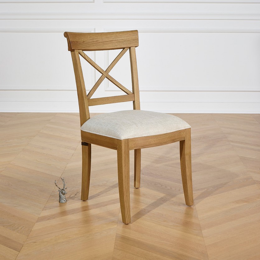 Nos chaises Port Royal sont conçues pour ajouter une note de style anglais à votre espace de repas. Fabriquées avec soin à partir de chêne massif et de tissu en lin premium, elles représentent l'esthétique distinctive du style Shabby chic.