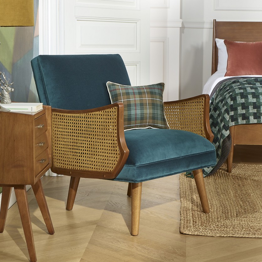 Découvrez notre fauteuil CUBA, une pièce artisanale de style scandinave. Alliant velours, cannage et bois massif de teinte noyer, ce fauteuil a tout pour plaire.