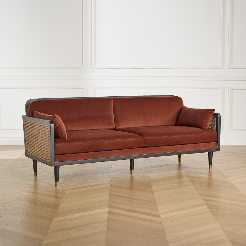 Scopri il divano ARABELLA che unisce comfort e stile grazie alla sua struttura in legno, ai dettagli in rattan intrecciato e ai cuscini in velluto di cotone, portando un'atmosfera accogliente e chic al tuo salotto.