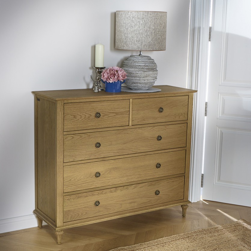 Il vantaggio del prodotto: Con il nostro comò in rovere OLIVIA, la funzionalità incontra l'estetica. Approfitta dei suoi 5 cassetti organizzati e del suo fascino senza tempo per creare un'atmosfera unica nella tua camera da letto.
