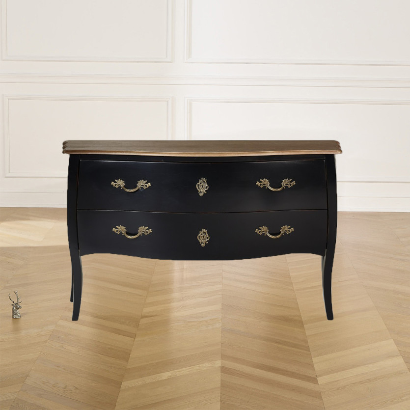 Le sue maniglie e le ferrature in stile Luigi XV conferiscono la finitura perfetta all'insieme, apportando un bel contrasto tra il nero laccato e il bronzo.