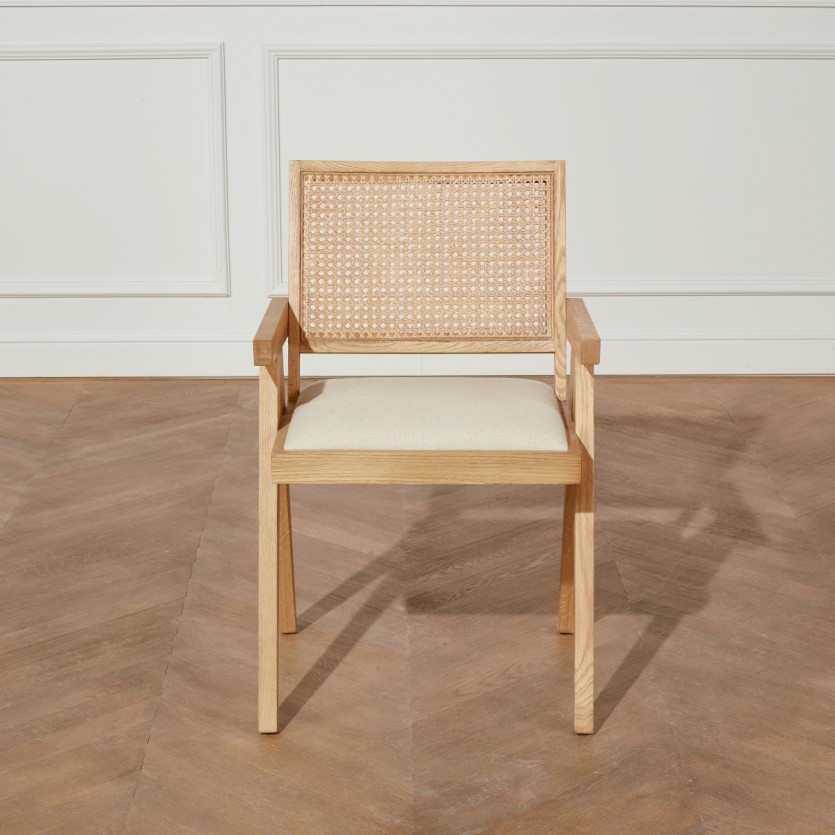 Ispirata agli anni '50, questa poltrona presenta linee grezze e minimaliste, addolcite da un intreccio tradizionale sullo schienale. La seduta è leggermente imbottita e rivestita in tessuto di lino naturale.