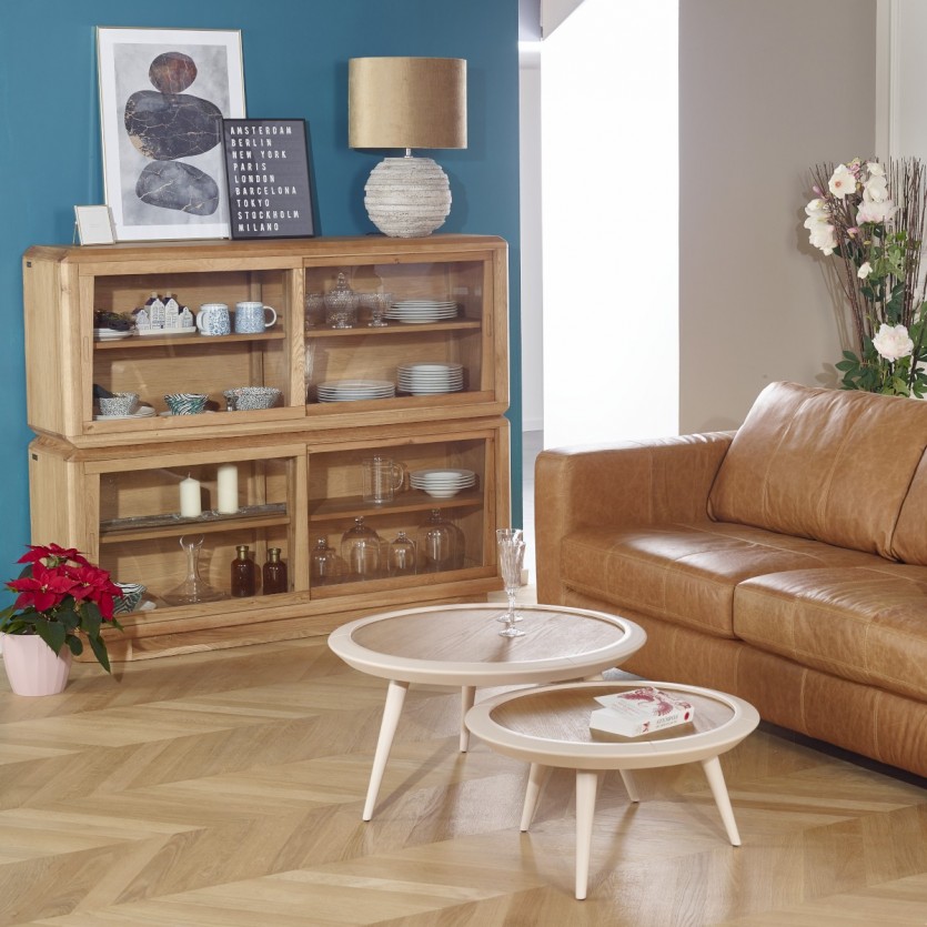 Il rovere impiallacciato dona un tocco caldo, mentre il pino massiccio verniciato in beige rosato aggiunge una nota dolce e contemporanea al tuo interno.